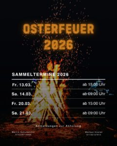 Sammeln von Baum- und Strauchschnitt für das Osterfeuer 2026 28. Februar 2026Dominik Schwarz Der Spielmannszug Alfen sammelt in diesem Jahr wieder Baum- und Strauchschnitt für das Osterfeuer. Eigene Anlieferungen sind an den genannten Tagen möglich.